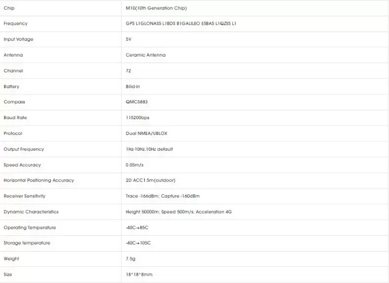 Le Foxeer M10Q 120 GPS est un module de navigation haute performance spécialement conçu pour les avions RC et les drones FPV. Il est doté d'une puce avancée de 10e génération (M10) qui offre une navigation précise et fiable. Il prend en charge plusieurs constellations, notamment GPS L1, GLONASS L1, BDS B1, Galileo E, SBAS L1 et QZSS L1 pour un positionnement précis sur une large plage. Il est équipé d'une boussole QMC5883 intégrée pour fournir des données directionnelles précises (garantissant un vol stable même dans des environnements magnétiques difficiles) et d'une antenne céramique haute performance (avec une sensibilité de détection de -166 dBm et une sensibilité de capture de -160 dBm) pour une acquisition et une stabilité du signal améliorées. Il offre également une double prise en charge des protocoles NMEA/UBX pour une intégration facile avec divers systèmes et une fréquence de sortie configurable de 1 Hz à 10 Hz (10 Hz par défaut) pour répondre à différents besoins. En termes de spécifications, il présente une tension d'entrée de 5 V, un débit binaire de 115 200 bps, une précision de vitesse de 0,05 m/s, une précision de positionnement horizontal de 1,5 m (en extérieur), des caractéristiques dynamiques incluant une altitude maximale de 50 000 m, une vitesse maximale de 500 m/s et une accélération maximale de 4 g, une plage de température de fonctionnement de -40 °C à +85 °C, une plage de température de stockage de -40 °C à +105 °C, un poids de seulement 2,7 g et des dimensions de 12,5 × 17 × 5 mm. L'emballage comprend 1 module GPS M10Q 120 et 1 jeu de câbles.
